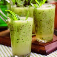 مواد لازم:½ لیوان (110 گرم) شکر½ (125 میلی‌لیتر) آب جوش8 عدد کیوی1/3 لیوان (80 میلی‌لیتر) آب لیمو (از 3 تا 4 لیمو)½ لیوان برگ نعناع2 لیوان یخیک لیوان (250 میلی‌لیتر) آب گازدار شکر و آب‌جوش را در یک پارچ با ...
